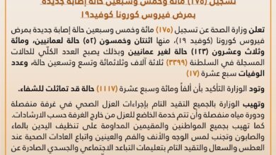 أعلنت وزارة الصحة عن تسجيل ١٧٥ مائة وخمس وسبعين حالة إصابة جديدة بفيروس كورونا #كوفيد١٩ لتصل إجمالي الحالات المسجلة في…