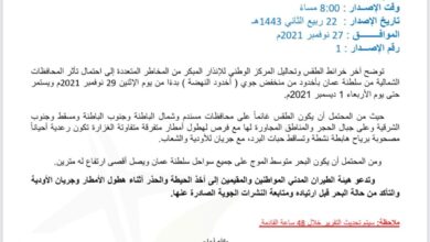 مسقط : ا لنبأ إليكم فيما يلي نشرة الأحوال الجوية المتوقعة لهذا اليوم الأحد الموافق : ٥ ديسمبر ٢٠٢١م حالة…