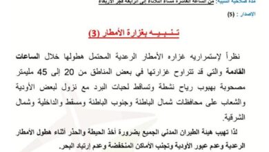 مسقط : العمانية نظراً لإستمرارية غزارة الأمطار الرعدية المحتمل هطولها خلال الساعات القادمة والتي قد تتراوح غزارتها في بعض المناطق…