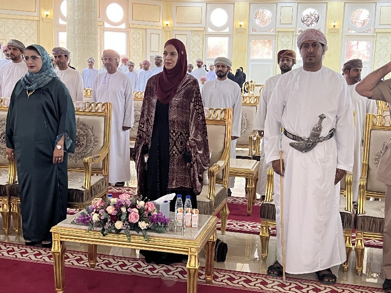 بعدها قدم الطلبة فقرة فنية مشتركة تخللها قصيدة وطنية من تقديم بيان البادية وميرة المقبالية من مدرسة ميمونة بنت الحارث مصحوبة بفن البرعة من تقديم طلبة مدرستي عزان بن قيس والسلطان للبنين.