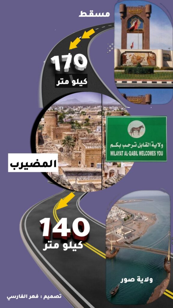 وتعد قرية “المضيرب” التاريخية التي تأسست في أواخر القرن العاشر الميلادي، بطابعها المعماري القديم وبيوتها الأثرية العتيقة المتفردة بزخرفها التراثي العماني الجميل، نموذجًا متكاملًا لمدن الريف العماني الأصيل، وكنموج للمدن الأثرية القديمة المحصنة لتميزها بوجود سور يحيط بها يحتوي على أربع بوابات يطلق عليها محليًا اسم “دراويز”، وقد كانت في السابق مداخل رئيسية لها، ولاحتوائها على أكثر من خمسين مبنى أثريا متوزعة بين حصون وقلاع وأبراج متناثرة على مداخلها، ومنها ما هو مشيد في قمم الجبال ما زالت آثارها موجودة كشاهد على التاريخ، ولكن معظمها بحاجةٍ للترميم، ومجالسها العامة وأفلاجها و”مركاض كشام” التاريخي لعرضة الخيل والإبل، الذي ما زالت فعالياته مستمرة، ولكن بحاجةٍ لإضفاء بعض اللمسات التجميلية عليه.