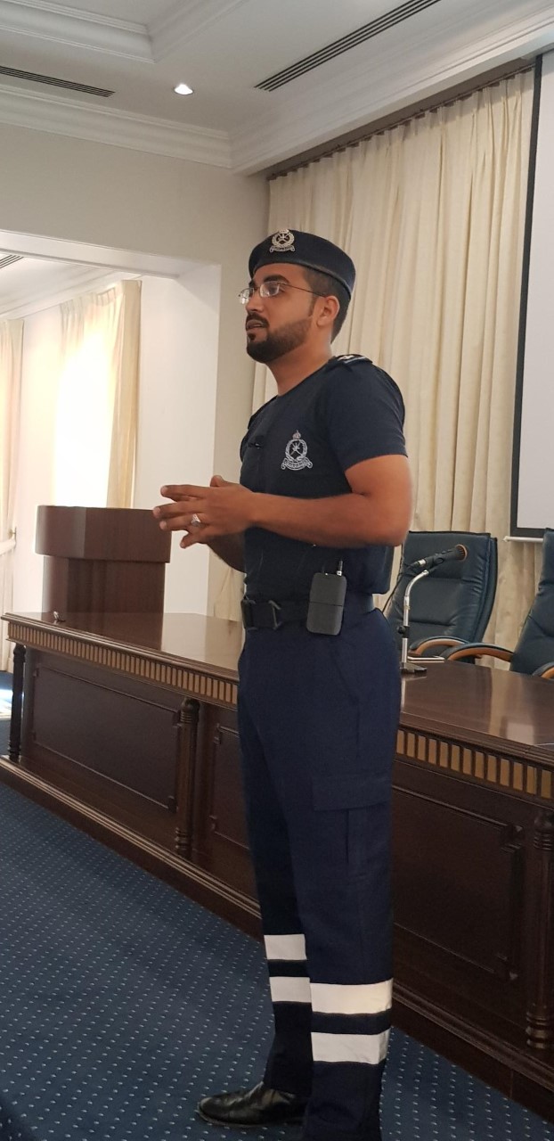 القى المحاضرة الملازم اول يوسف بن جمعه الفلاحي مساعد رئيس قسم العمليات والتدريب بمحافظة مسقط بالهيئة العامة للدفاع المدني والاسعاف تناول من خلالها عددا من المواضيع من بينها التعريف بنشأة الدفاع المدني والإسعاف والخدمات التي تقدمها الهيئة.