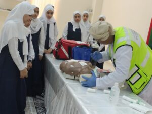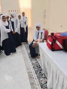 وفي نهاية المحاضرة شاركت طالبات مدرسة سلمى بنت قيس للتعليم الأساسي في شرح كيفية إسعاف شخص ابتلع جسماً واصيب بالاختناق وأيضاً كيفية إسعاف شخص أصيب بالإغماء .