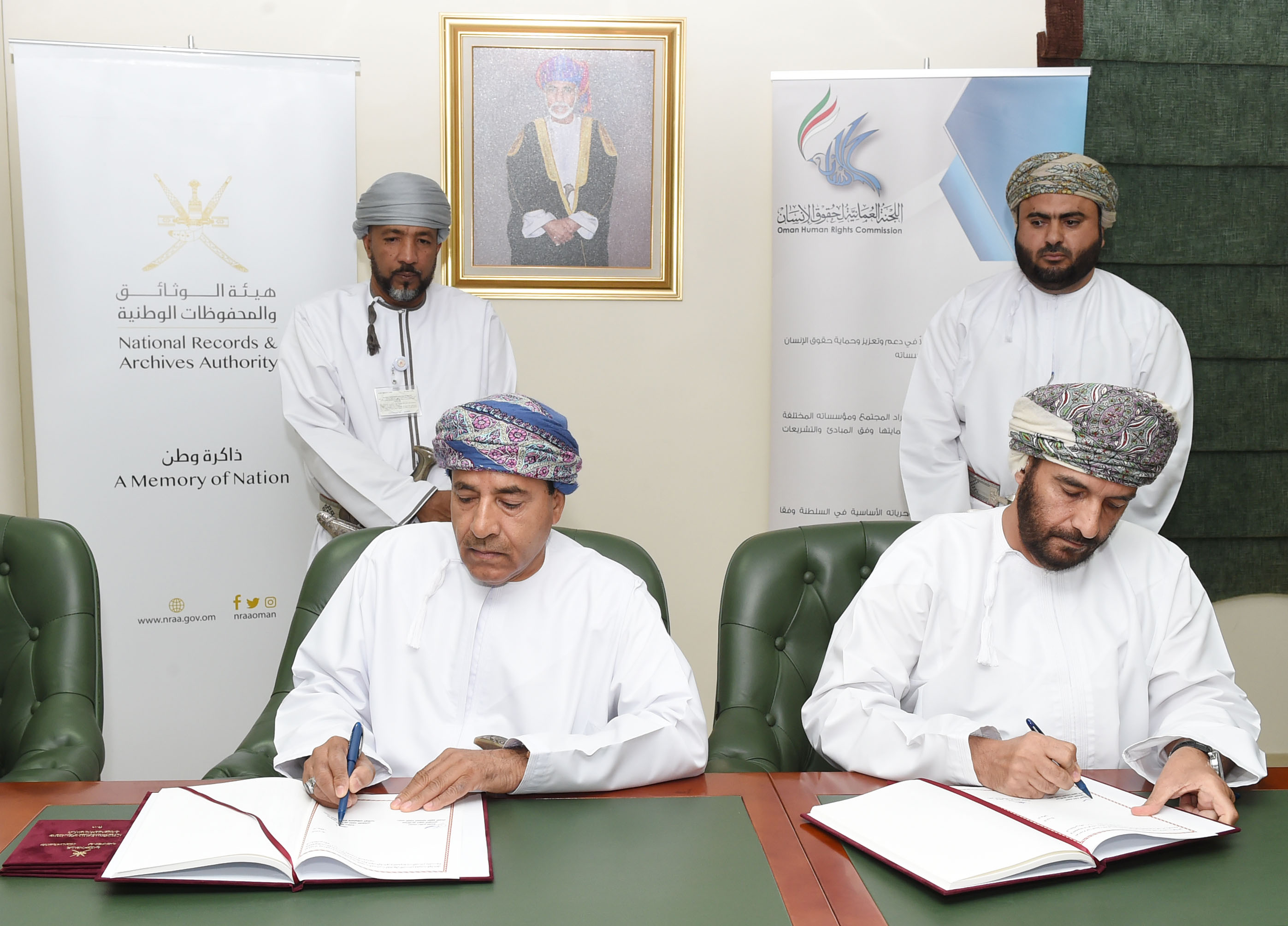 وقع الاتفاقية من جانب اللجنة العُمانية لحقوق الإنسان المكرم الشيخ عبدالله بن شوين الحوسني رئيس اللجنة ومن جانب هيئة الوثائق والمحفوظات الوطنية سعادة الدكتور حمد بن محمد الضوياني رئيس الهيئة.