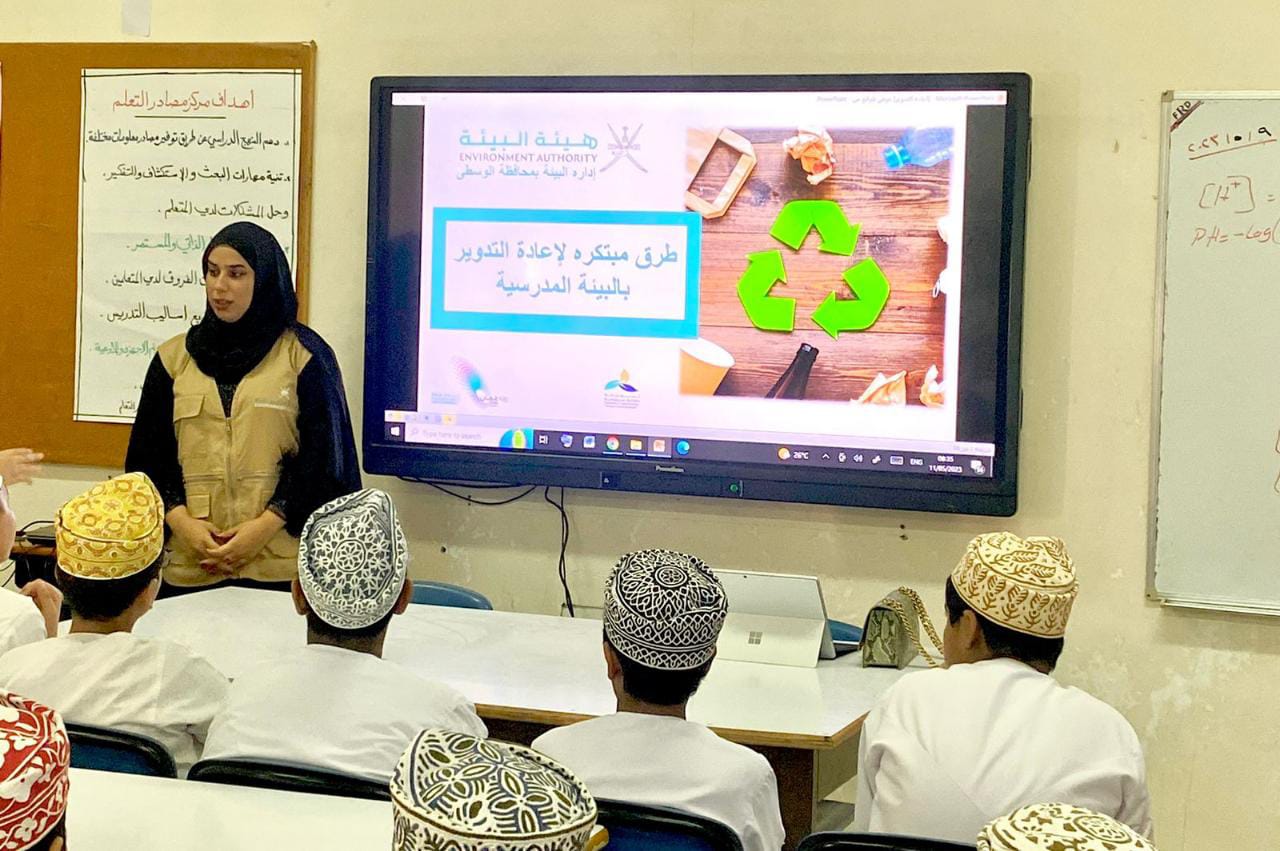 ضمن البرنامج التوعوي للخطة السنوية ٢٠٢٣، نفذت إدارة البيئة بمحافظة الوسطى حملة توعوية في مدارس ولاية هيماء حول التحديات البيئية وتوظيفها باتجاهات علمية وتطويرية للمجتمع وذلك بالشراكة مع المديرية العامة للتربية والتعليم بمحافظة الوسطى بهدف نشر التوعية بين أفراد المجتمع ضمن مبدأ الاستدامة وحماية البيئة وحقوق الأجيال القادمة وتعزيز النشاطات والبرامج الصديقة للبيئة للحد من كمية إنتاج الملوثات والنفايات بأنواعها المختلفة.