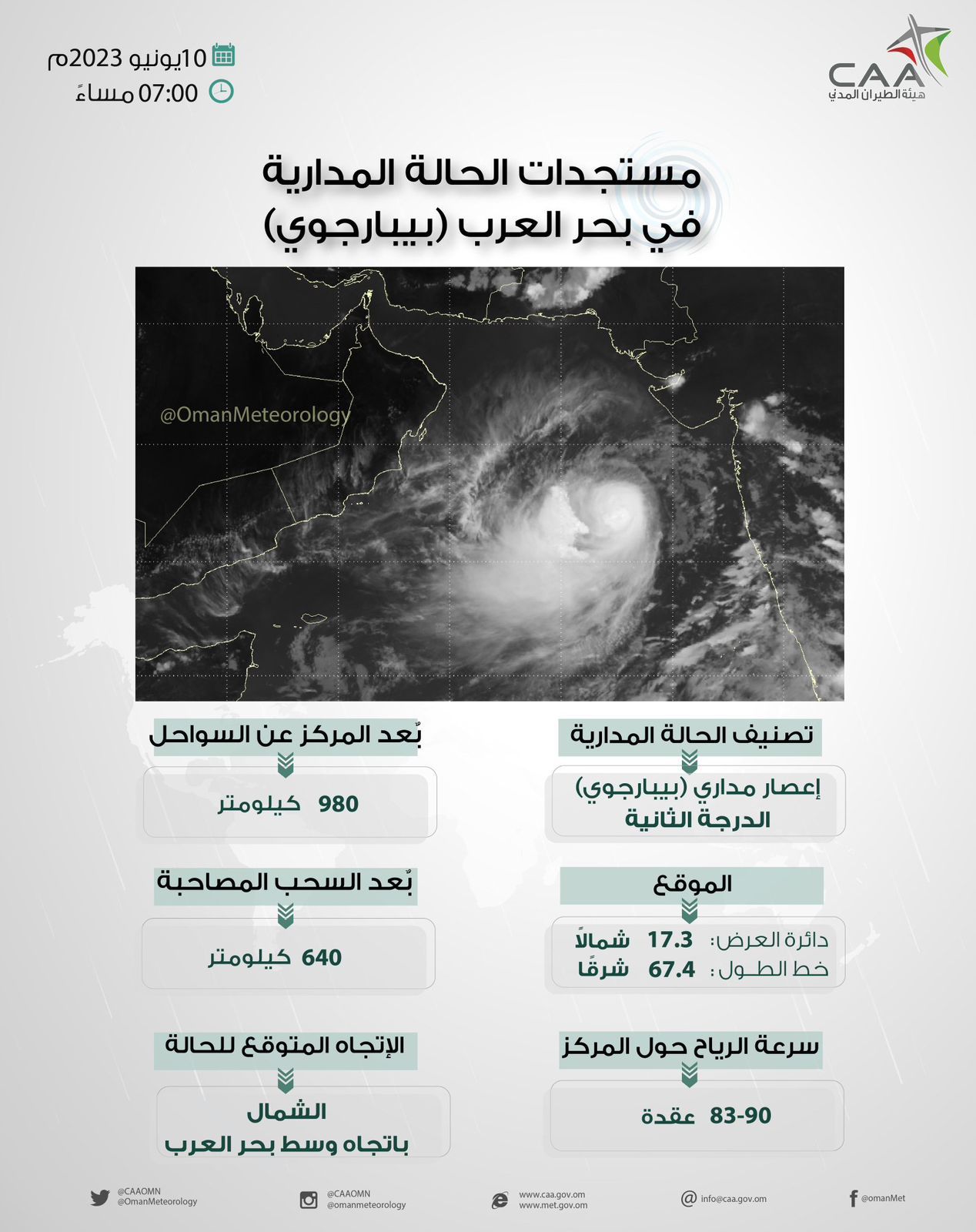 أكد عبدالله الخضوري مدير عام الأرصاد الجوية العمانية : تطور الحالة المدارية في بحر العرب إلى إعصار من الدرجة الثانية ، ويبعد مركزه عن سواحل سلطنة عمان 980 كم ويتحرك شمالا لوسط بحر العرب ثم إلى باكستان/ الهند لاحقا ؛ ولا يوجد تأثير مباشر على سلطنة عمان