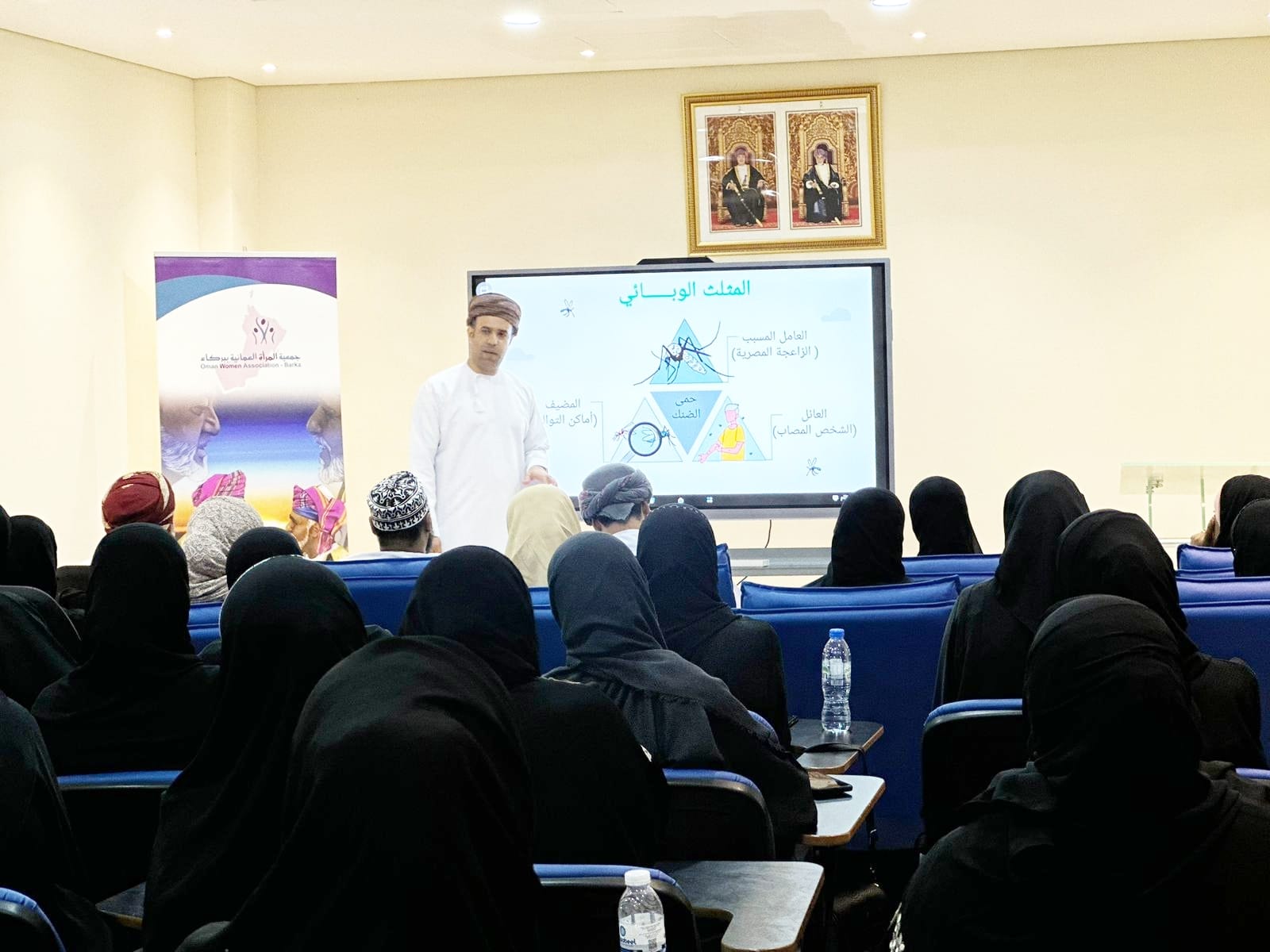 في إطار الحملة الوطنية المشتركة لمكافحة الزاعجة في محافظة جنوب الباطنة وضمن الحملة الإعلامية والتوعوية الهادفة إلى توعية المجتمع فيما يتعلق بحمى الضنك وبعوضة الزاعجة ، نظمت #صحية_جنوب_الباطنة وبالتنسيق مع جمعية المرأة العمانية بولاية بركاء ونادي الشباب ورشة عمل تدريبية حول دور الإصحاح البيئي المنزلي في مكافحة الزاعجة وذلك في قاعة مارينا الميناء بالولاية..
