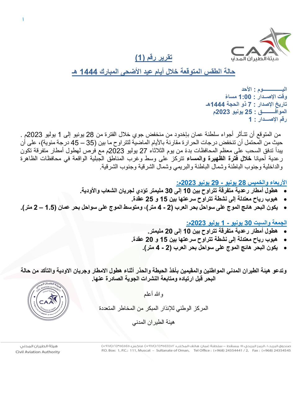 تقرير رقم (1) عن حالة الطقس خلال أيام عيد الأضحى المبارك
