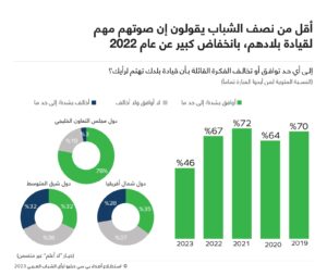 • ثلثا الشباب العربي في دول شمال أفريقيا وشرق المتوسط يقولون إن قيادات بلدانهم لا تهتم لرأيهم، بانخفاض كبير عن عام 2022