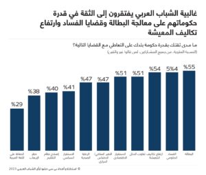 وعن أبرز المشكلات التي يواجهونها، أشار الشباب العربي إلى البطالة، والفساد الحكومي، وارتفاع تكاليف المعيشة، وعدم الاستقرار الاقتصادي، والتغير المناخي. وأعرب الشباب الخليجي عن ثقتهم القوية بقدرة حكوماتهم على التعامل مع جميع تلك القضايا.