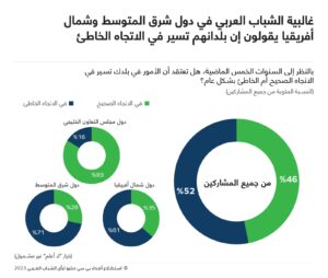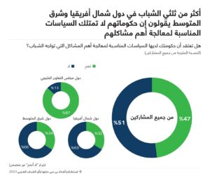 تبدو الصورة مناقضة تماماً في دول شمال أفريقيا وشرق المتوسط؛ حيث قال ثلث الشباب العربي المشاركين في الاستطلاع من هاتين المنطقتين إن صوتهم مهم لقيادة بلدانهم، بينما قال 63٪ من المشاركين في شمال أفريقيا و66٪ من شباب شرق المتوسط إن حكوماتهم لا تمتلك السياسات المناسبة لمعالجة أهم مشاكلهم.