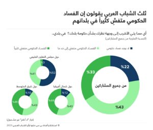 ويعتبر الكسب غير المشروع مصدر قلق واضح للشباب العربي في المنطقة، حيث قال ثلث (33٪) المشاركين في الاستطلاع إن “الفساد الحكومي متفشٍّ كثيراً” في بلدانهم. ويخيم هذا الشعور بشكل أكبر في دول شمال أفريقيا (87٪) وشرق المتوسط (89٪).