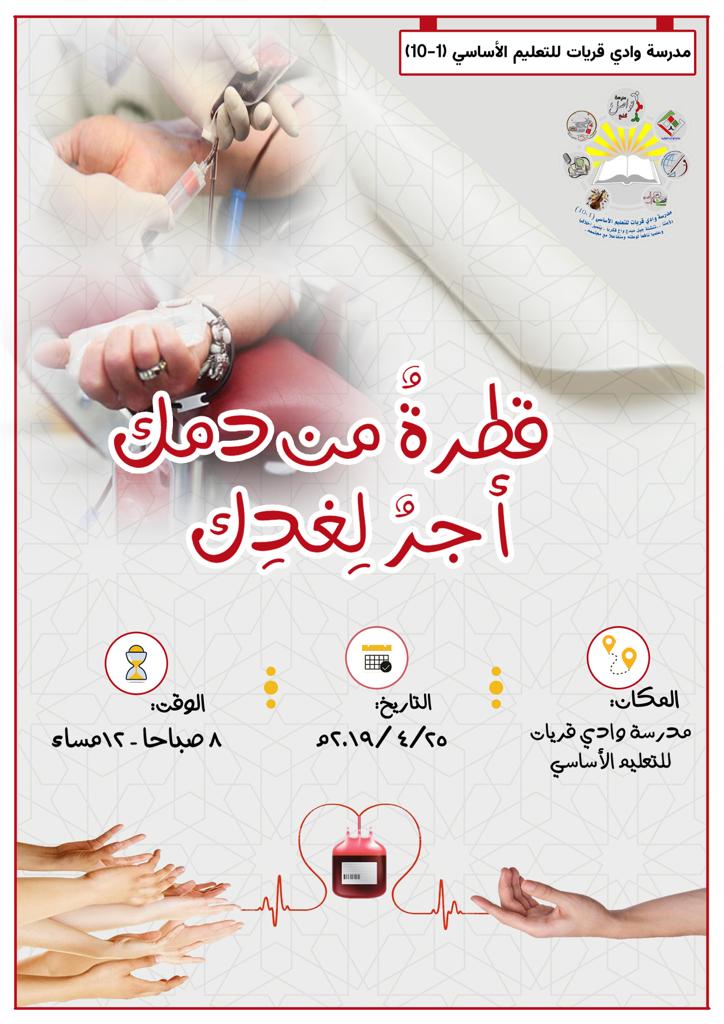 تنظم مدرسة وادي قريات ببهلاء حملة إنسانية رائعة للتبرع بالدم،وذلك يوم الخميس المقبل في المدرسة، و التحضيرات قائمة على قدم وساق لتهيئة المكان الملائم الذي يستطيع الكادر الطبي المشارك العمل فيه لأخذ الدم من المتبرعين.