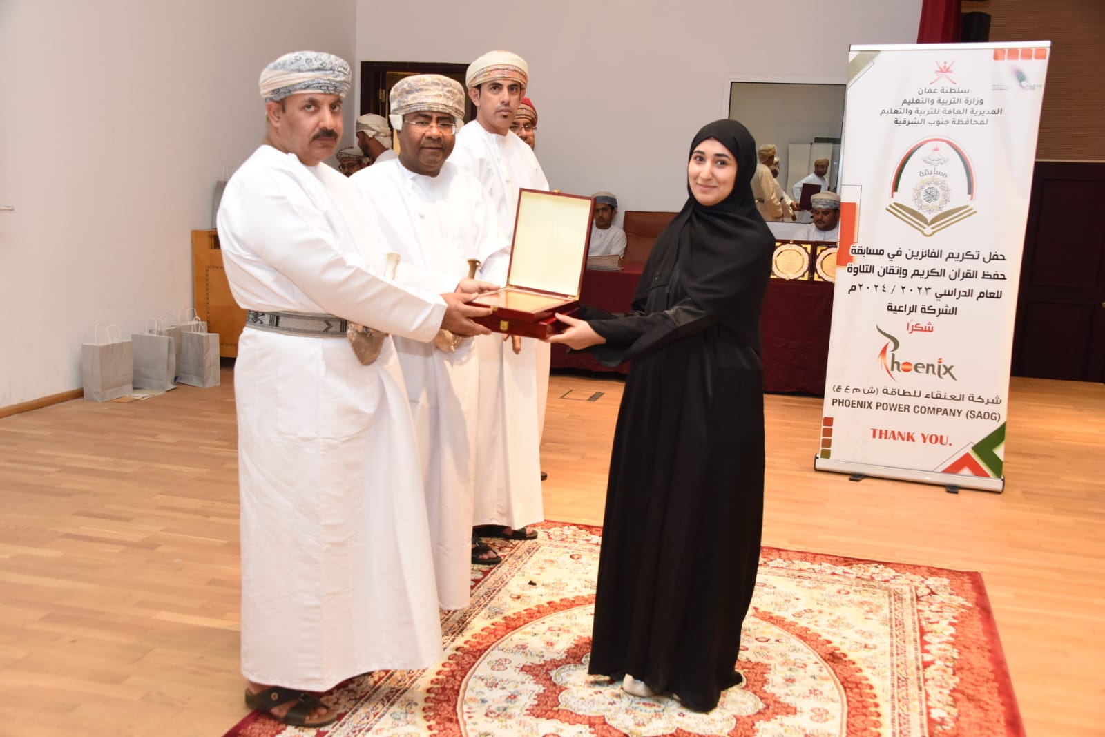 وختم كلمته قائلا : لا يسعنا في الختام إلا أن نهنئ الطلاب والطالبات والمدارس الفائزة وأولياء الأمور على تميزهم ووصولهم لمنصة التتويج ونقول لأبنائنا إن الطريق متاح للجميع للحفظ والتجويد والتميز ونحث غيرهم من الطلبة أن يحذو حذوهم فيا لها من تجارة رابحة مع الله عز وجل (إن الله لا يضيع أجر من أحسن عملا) كما نشكر المدير العام على رعايته الدائمة لهذه المسابقة وما لهذه الرعاية من دعم لأبنائه الطلاب والطالبات كما نشكر الشركة العمانية للغاز الطبيعي المسال التي دعمت هذا الحفل سائلين المولى عز وجل أن يديم البركة والنعم على عمان وشعبها في ظل هذا العهد الميمون لمولانا صاحب الجلالة السلطان هيثم بن طارق المعظم حفظه الله ورعاه.