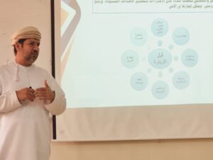 حيث قدمت مريم بنت علي البلوشي رئيسة قسم دعم فرق الإشراف التربوي ورقة عمل تضمنت التعريف بآلية عمل الاطار العام لمنهجية الفرق الإشرافية ومجالاته ومعاييره ومؤشراته وخطة تطوير المدرسة وتوضيح إجراءات عمل فرق التقويم الذاتي بالمدارس في تطبيق المنهجية ودور الفرق الإشرافية في تهيئه المدارس للتقييم الخارجي من قبل هيئة الاعتماد الأكاديمي، كما تناولت شميسة بنت حمد المعمرية مشرفة أولى تقنية المعلومات ورقة عمل لتحسين وتطوير مهارات الفرق الإشرافية في جمع الأدلة التي تعطي الأداء العام لمستوى المدرسة و كيفية الحكم على مجالات المنهجية في الزيارة الصفية؛ فيما قدم منصور بن راشد المطاعني مشرف أول إدارة مدرسية ورقه عمل تتضمن التعريف بتفسير مجالات النمو الشخصي و القيادة والادارة المدرسية و النماذج الخاصة بها في تشخيص أداء المدرسة وتوصيف المؤشرات والمصادر التي من خلالها يتم تقصي الملاحظات وإيجاد طرق تعزيزها وتطويرها.