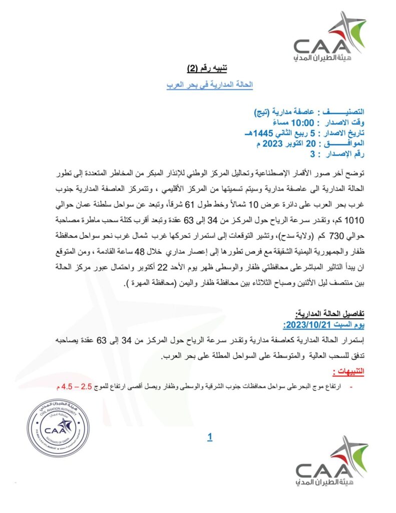 تنبيه رقم (2) الحالة المدارية في بحر العرب