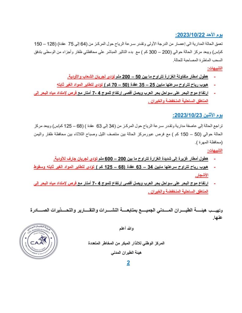 ان يبدأ التأثير المباشرعلى محافظتي ظفار والوسطى ظهر يوم الأحد 22 أكتوبر واحتمال عبور مركز الحالة
