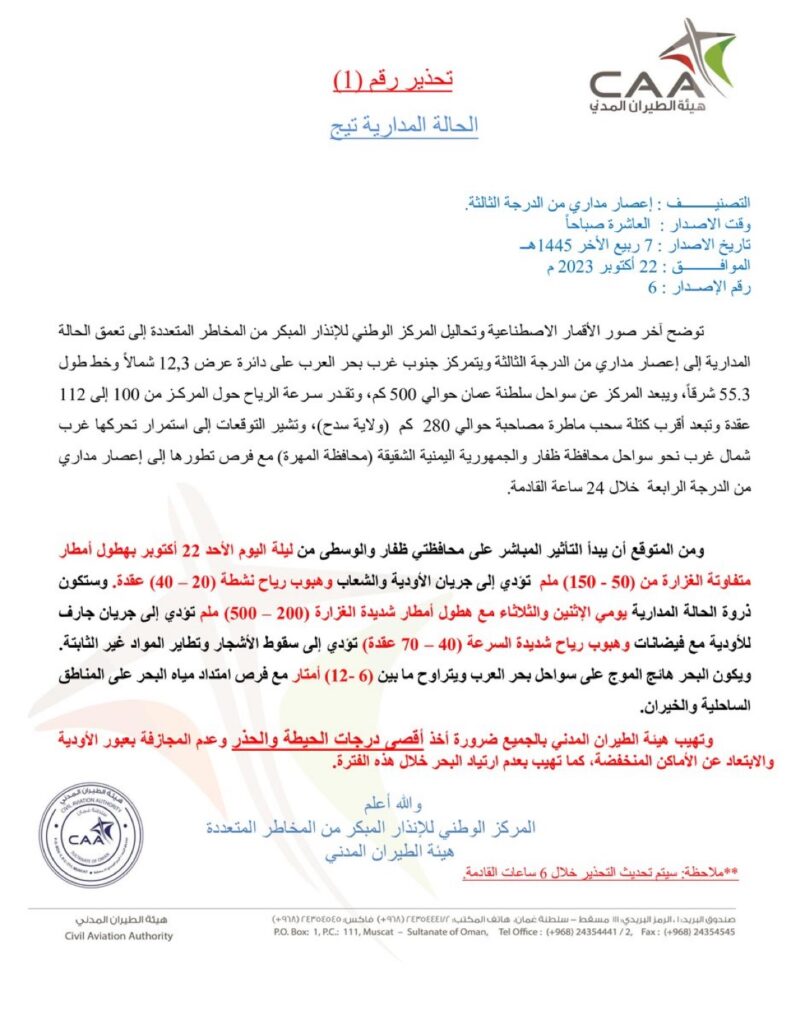 ومن المتوقع أن يبدأ التأثير المباشر على محافظتي ظفار والوسطى من ليلة اليوم الأحد 22 أكتوبر بهطول أمطار متفاوتة الغزارة من (50 – 150) ملم تؤدي إلى جريان الأودية والشعاب وهبوب رياح نشطة (20 – 40) عقدة. وستكون ذروة الحالة المدارية يومي الإثنين والثلاثاء مع هطول أمطار شديدة الغزارة (200 – 500) ملم تؤدي إلى جريان جارف للأودية مع فيضانات وهبوب رياح شديدة السرعة (40 – 70 عقدة) تؤدي إلى سقوط الأشجار وتطاير المواد غير الثابتة.