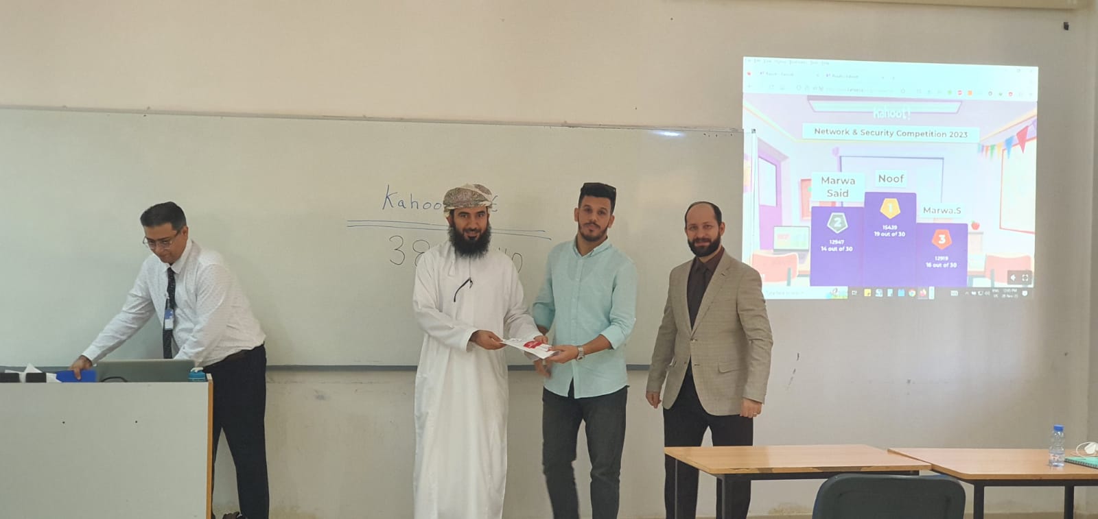 وفي نهاية المسابقة تم اختيار أفضل خمسة متسابقين، وهم الذين حققوا أكبر عدد من الإجابات الصحيحة في أقل وقت ممكن، وقد قام الدكتور أحمد بن زهران البراشدي نائب مساعد الرئيس للشؤون الأكاديمية، والدكتور الحمزة منذر الألوسي رئيس القسم بتوزيع الجوائز على الطلبة الخمسة الأوائل.