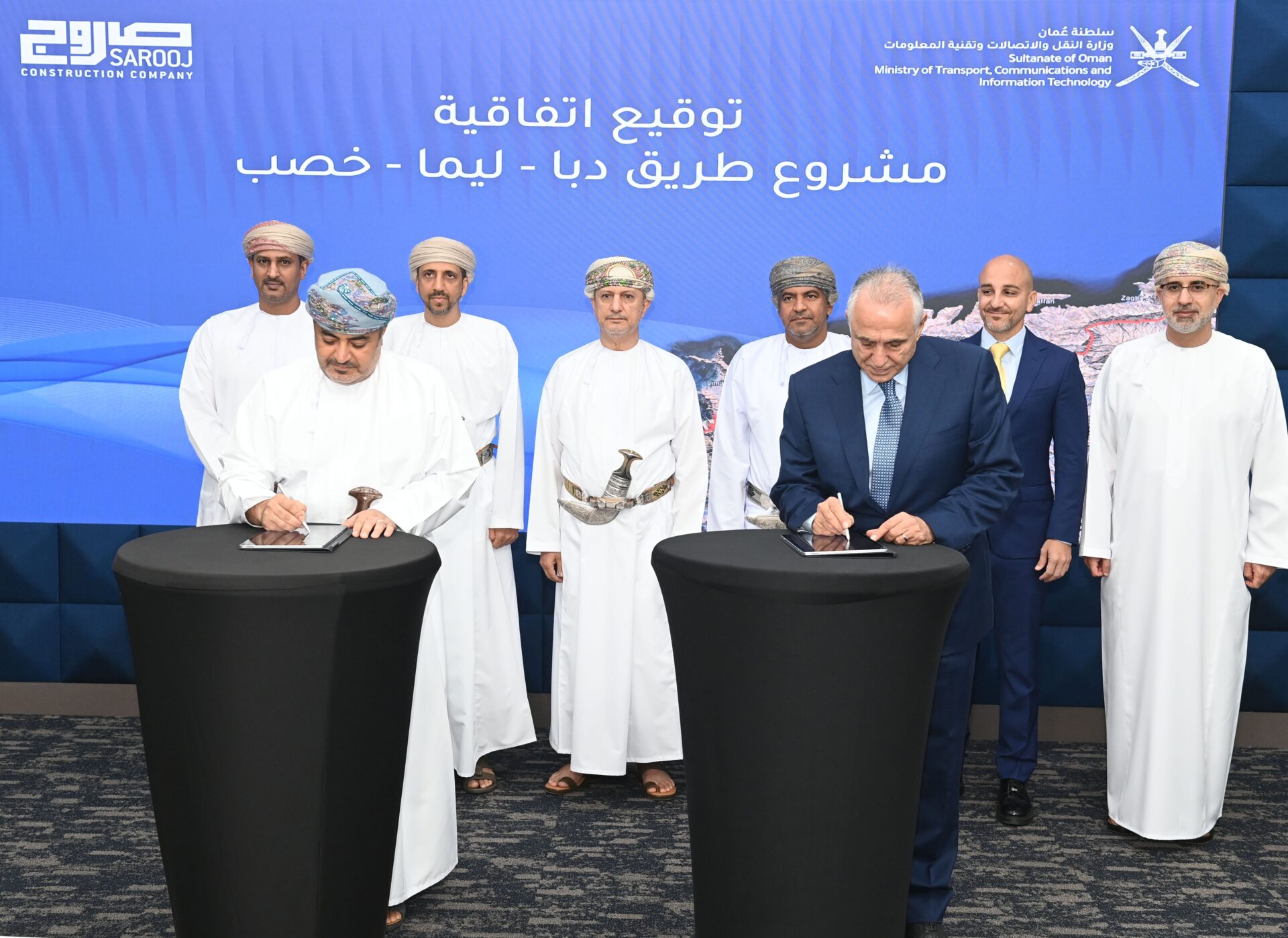 وقع الاتفاقية عن وزارة النقل والاتصالات وتقنية المعلومات معالي المهندس سعيد بن حمود المعولي وزير النقل والاتصالات وتقنية المعلومات، فيما وقعها من جانب شركة الصاروج للإنشاءات الفاضل غازي الحلو العضو التنفيذي لمجلس إدارة الشركة بحضور معالي سلطان بن سالم الحبسي وزير المالية ومعالي السيد إبراهيم بن سعيد البوسعيدي محافظ مسندم