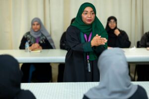 يتطرق البرنامج إلى جوانب تطبيقية ونظرية مختلفة تتمثل في التعرف على الخامات المستخدمة وطرق تصميم السعفيات وحياكة المنسوجات التقليدية، وصولا إلى طرق عرضها وتسويقها وكيفية البحث عن شراكات استراتيجية ترمي إلى استدامة المشاريع وتوسعها في نطاقات أوسع، ويستمر البرنامج ليحقق قيمة ثقافية متأصلة والذي يسهم في دعم المرأة ،وستشارك المتدربات عمليا في مختلف الحرف لتستمر خلال 3 أشهر القادمة .