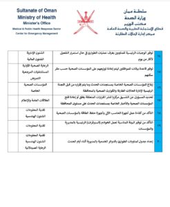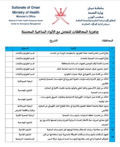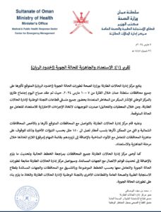 كما أوصى مركز إدارة الحالات الطارئة جميع المحافظات بمراجعة الخطط الحالية وتحديث ما يلزم بالإضافة إلى تحديث قوائم الاتصال مع الجهات المساندة. وسيواصل مركز إدارة الحالات الطارئة متابعة تطورات الحالة الجوية والتعامل معها بحسب الخطط الموضوعة وبالتنسيق مع المحافظات والجهات المساندة بقطاع الاستجابة الطبية والصحة العامة والقطاعات الأخرى باللجنة الوطنية لإدارة الحالات الطارئة واتخاذ ما يلزم بناء على تطورات الحالة الجوية.