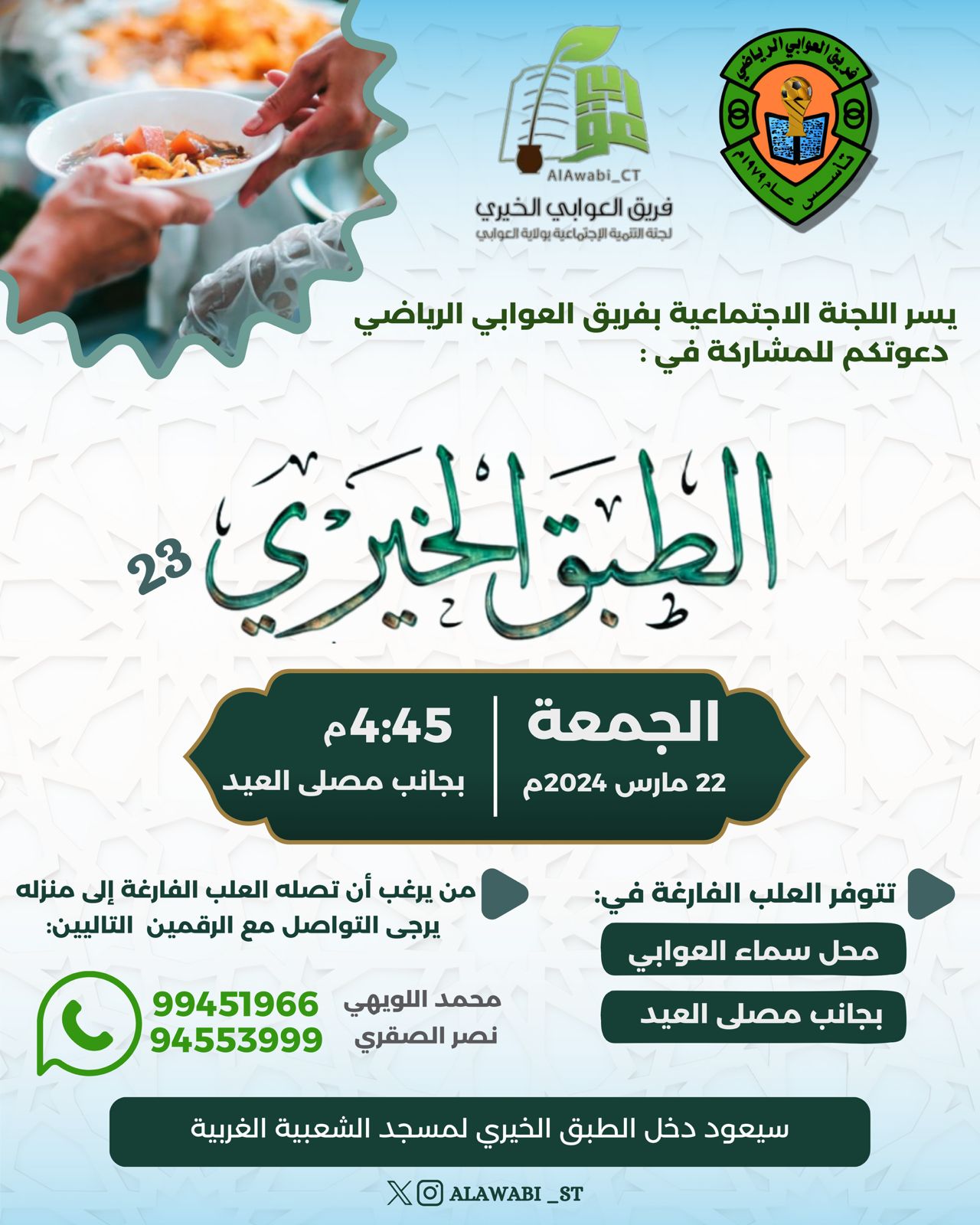 ينظم فريق العوابي الرياضي بولاية العوابي بمحافظة جنوب الباطنة ممثلا في اللجنة الاجتماعية مساء يوم الجمعة القادم الطبق الخيري (23) السنوي الذي ينظمه كل عام خلال شهر رمضان المبارك.