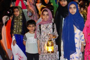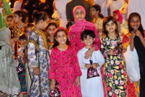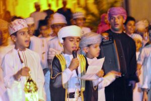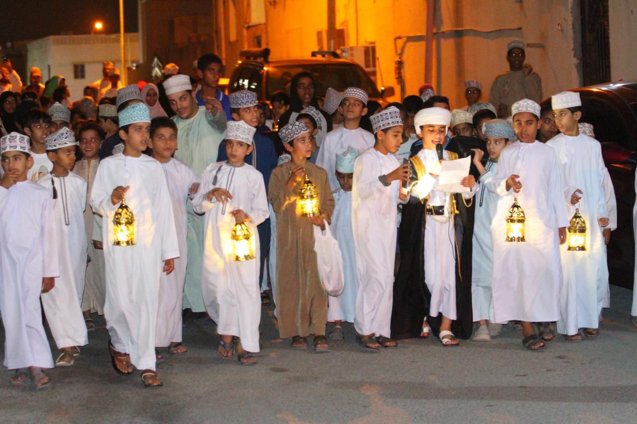 وقدم الطفل أحمد بن صالح الهطالي ” المهلل ” التسبيح والدعاء والابتهال لله تعالى بصوته الجميل وبألحان دينية مرددين معه الصغار والكبار بكلمة آمين متجولين في حواري للولاية وأزقتها حيث يستصف الأهالي لمشاهدة المشهد الديني الروحاني الجميل .