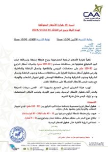 أصدرت هيئة الطيران المدني التنبيه (3) حول غزارة الأمطار خلال مساء اليوم الإثنين ويوم غدا الثلاثاء جاء فيه : –