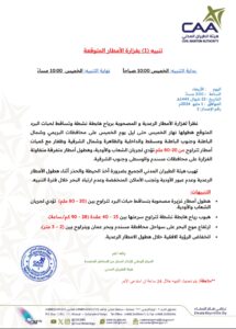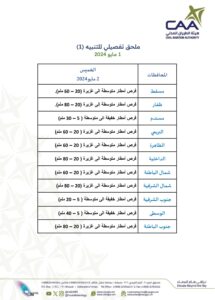 أصدرت هيئة الطيران المدني تنبيهها الأول حول غزارة الأمطار المتوقع هطولها خلال يوم غدا الخميس – جاء فيه : –