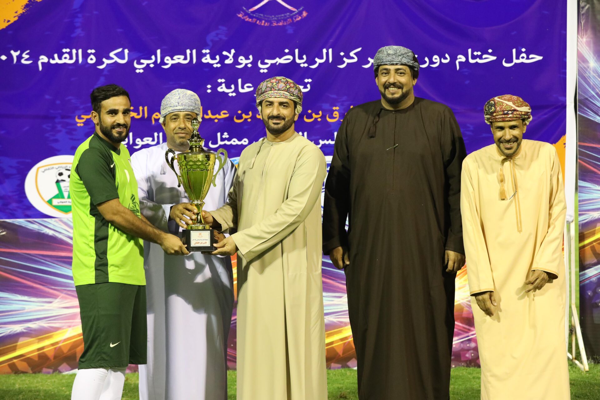 وفي نهاية اليوم الكروي المميز في ولاية العوابي كرم راعي حفل ختام الدوري الداعمين للدوري واللجان المنظمة للدوري، كما تم تكريم اللاعب محمد السيابي بجائزة هداف الدوري، والحارس داؤود البحري حارس فريق إتحاد العوابي بجائزة افضل حارس، وبعدها كرم لاعبي فريق العلياء بوصافة الدوري وفريق إتحاد العوابي بلقب البطولة. وفي الختام قدم رئيس المركز الرياضي وبمعيته رئيس اللجنة المنظمه هدية تذكارية لراعي المناسبة لرعايته الدوري.