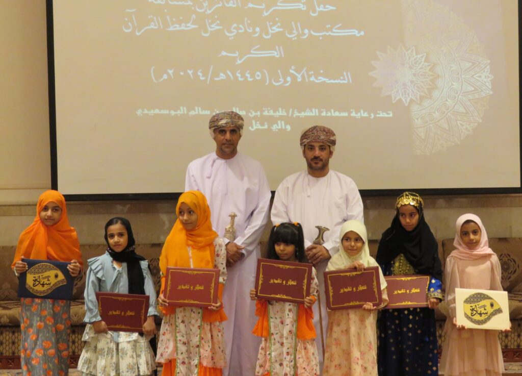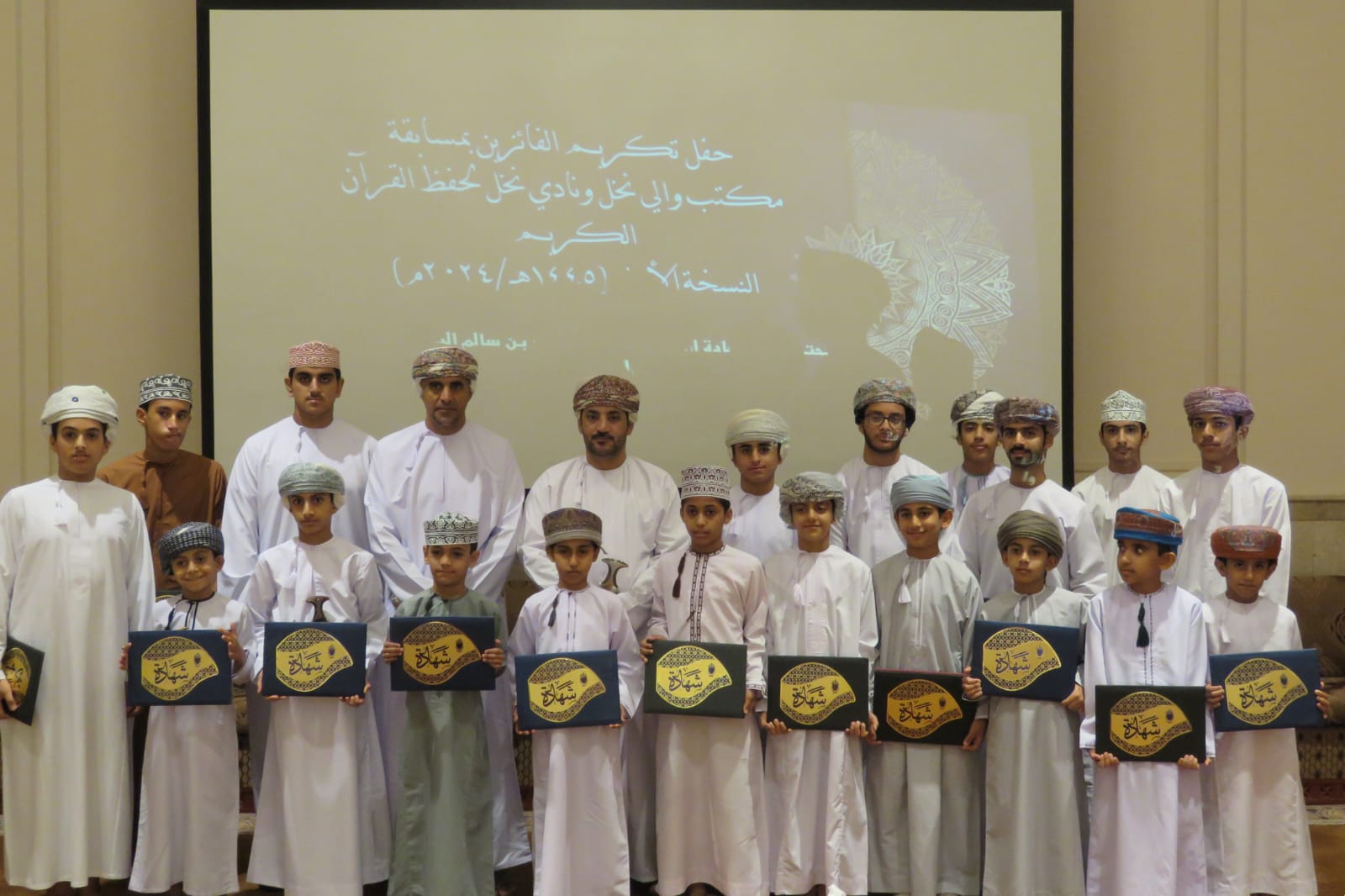 تحت رعاية سعادة الشيخ خليفة بن صالح البوسعيدي والي نخل وبحضور الدكتور أحمد بن جمعة الريامي رئيس نادي نخل وعدداً من موظفي مكتب الوالي وأعضاء مجلس إدارة النادي القائمين على المسابقة وبحضور أولياء أمور المتسابقين أقيم حفل تكريم مسابقة مكتب والي نخل ونادي نخل لحفظ القرآن الكريم لعام 1445 للهجرة في نسختها الأولى في قاعة متعددة الأغراض بجامع السلطان قابوس بولاية نخل .