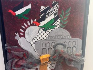 فقالت:شاركت في هذا المعرض بلوحتين الأولى ليلة النجوم بالهوية اليمنية أدخلت بها الطابع البناء اليمني الذي يدل عن صنعاء القديمة والثانية عن فلسطين حاولت دمج بها أكثر من خامة استخدمت خامة الطين للدلالة على أننا مخلوقين منه ونرجع إليه أما الشبك فهوالذي تم اختراقه في أحداث أكتوبر واللون الرمادي يدل على استمرار الأحداث واللون الأحمر يدل على لون الدماء التي ازهقت خلال الفترة الماضية.