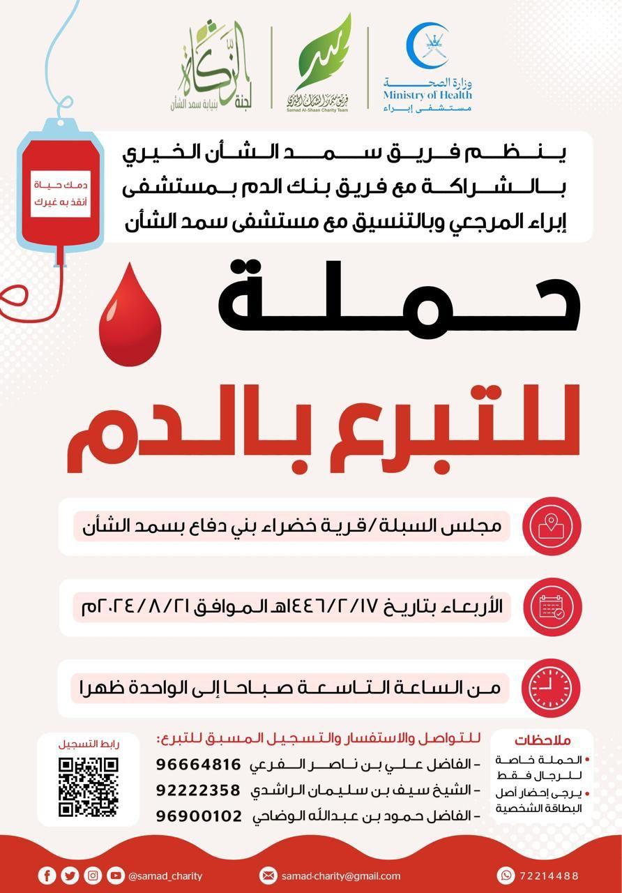 تنطلق صباح الأربعاء القادم حملة فريق سمد الشأن الخيري وبالتعاون مع بنك الدم بمستشفى إبراء المرجعي وبالتنسيق مع مستشفى سمد الشأن حملة التبرع بالدم في نسختها الثالثة وذلك بالمجلس العام بقرية خضراء بني دفاع بنيابة سمد الشأن بولاية المضيبي تنطلق الحملة في تمام الساعة التاسعة صباحا.
