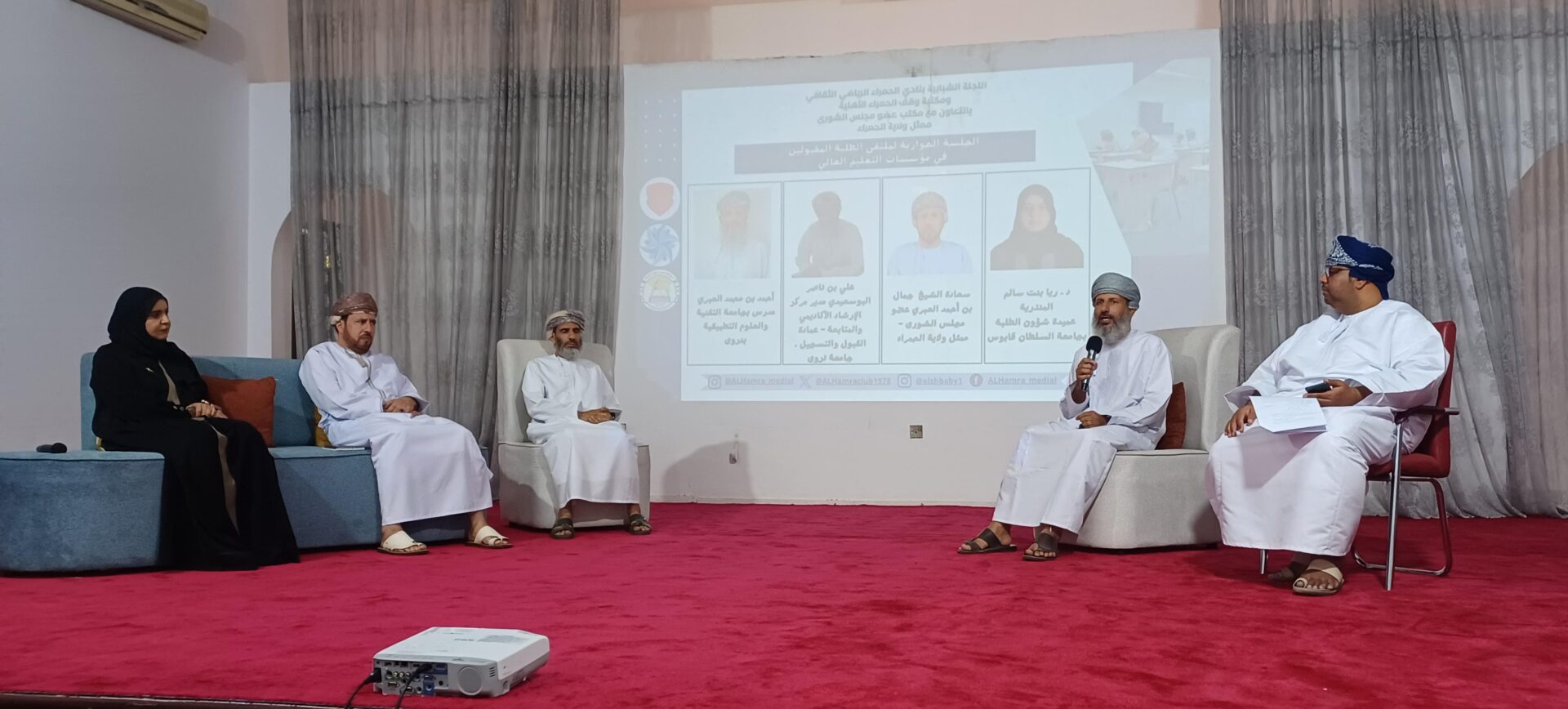 أقيم صباح امس بقاعة نادي الحمراء الرياضي الثقافي ملتقى الطلبة المقبولين في مؤسسات التعليم العالي بتنظيم اللجنة الشبابية و مكتبة وقف الحمراء الأهلية بالتعاون مع مكتب عضو مجلس الشورى ممثل ولاية الحمراء ..رعى فعاليات الملتقى سعادة الشيخ جمال بن أحمد العبري عضو مجلس الشورى ممثل ولاية الحمراء ورئيس لجنة التربية والبحث العلمي والابتكار بالمجلس.
