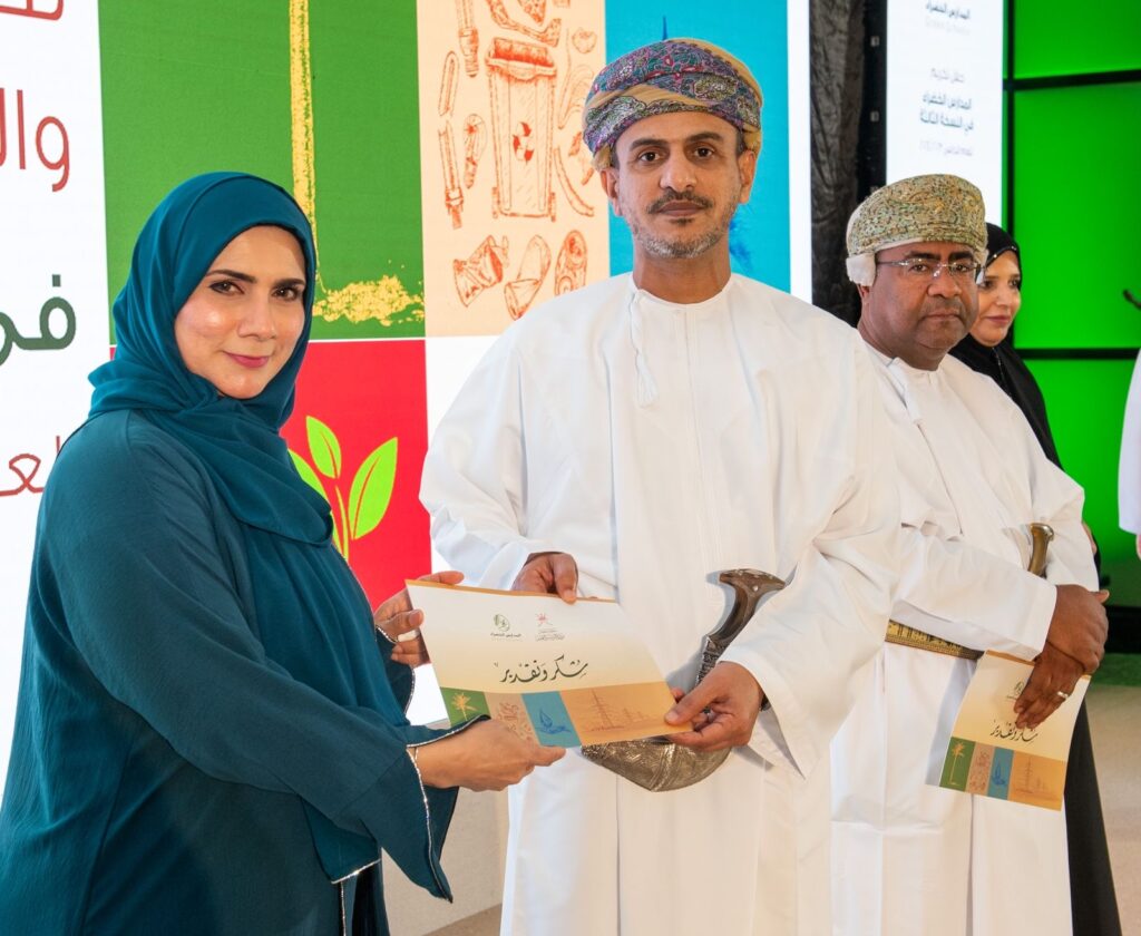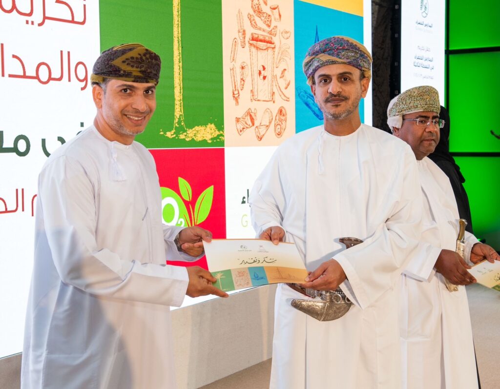 وتضمن الحفل أوبريت مسرحي بعنوان ” معا نكون أجمل” قدمته طالبات مدرسة جماح للتعليم الأساسي بتعليمية الداخلية تحدثت عن أهمية نشر الممارسات البيئية الصحيحة لحماية الأرض من التلوث، وغرس ثقافة المفاهيم البيئية كإعادة التدوير والاقتصاد الدائري والحياد الصفري، وفي الختام قام راعي المناسبة بتكريم الشركات الداعمة والمدارس المشاركة في مشروع “المدارس الخضراء” للعام الدراسي 2024/ 2025م.