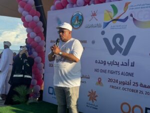وبعد انتهاء المسير تفضل سعادة راعي المسيرة بتفقد الأركان التوعوية المصاحبة للمسيرة والتعرف عليها ثم أقيمت الفعاليات المصاحبة التي بدأت بكلمة الجمعية وألقاها رئيس الجمعية العمانية للسرطان فرع محافظة ظفار سالم بن عوض النجار حيث رحب بسعادة راعي المسير والمشاركين وجميع الحضور وقال في كلمته : نلتقي اليوم مع شرائح مختلفة من المجتمع للمشاركة في المسير السنوي تحت شعار لا أحد يحارب وحده وتواجدنا اليوم هو للتكاتف ولدعم وبث الامل و لإيصال رسالة الجمعية إلى مختلف شرائح المجتمع سواء بما يتعلق باهداف الجمعية أو فيما يتعلق بالنشاط البدني الذي يجنبنا الكثير من الامراض وكذلك التوعية والتثقيف الصحي ومن خلال الجمعية يتم نشر الوعي نحو إجراء الفحص المبكر والكشف عن المرض في مراحله الأولى حتى يسهل العلاج كذلك من ضمن أهداف الجمعية النشاط البدني الذي يحافظ على صحة الجسم وكذلك تناول الغذاء الصحي.
