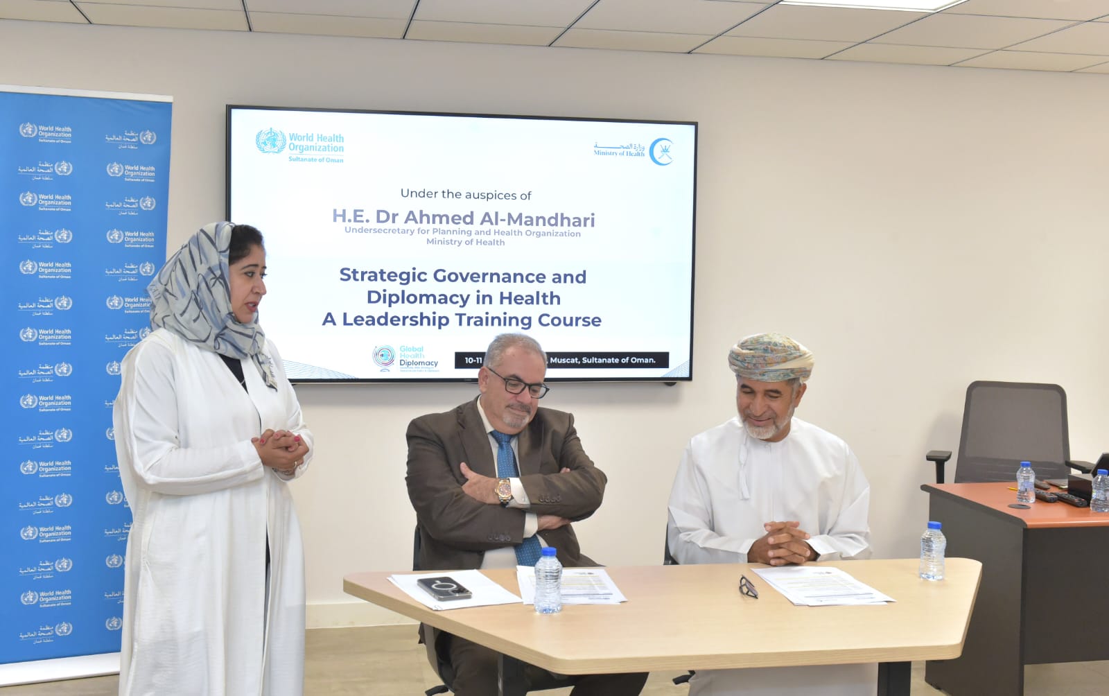 الدورة التدريبية حول الحوكمة الإستراتيجية والدبلوماسية في مجال الصحة هذه تنظمها وزارة الصحة للمرة الأولى على مستوى إقليم شرق المتوسط، ويشارك فيها 35 موظفا من عدد من الوزارات الحكومية بسلطنة عمان مثل الخارجية، والتربية والتعليم، والتنمية الاجتماعية، والثروة الزراعية والسمكية وموارد المياه، بالتعاون مع المكتب الإقليمي بمنظمة الصحة العالمية ، وتهدف إلى التعريف بتاريخ هيئات إدارة منظمة الصحة العالمية ومهماتها، وتعزيز فهم عمل القرارات والسياسات لمنظمة الصحة العالمية، واستكشاف أدوار جمعية الصحة العالمية، والمجلس التنفيذي، واللجنة الإقليمية، وأهمية الدبلوماسية في منطقة شرق المتوسط، ورؤى سلطنة عمان وتجربتها في الدبلوماسية الصحية، وتضمن برنامج الدورة تمارين عملية لتطوير المهارات في كتابة البيانات والقرارات وأوراق المواقـف وصياغتها.