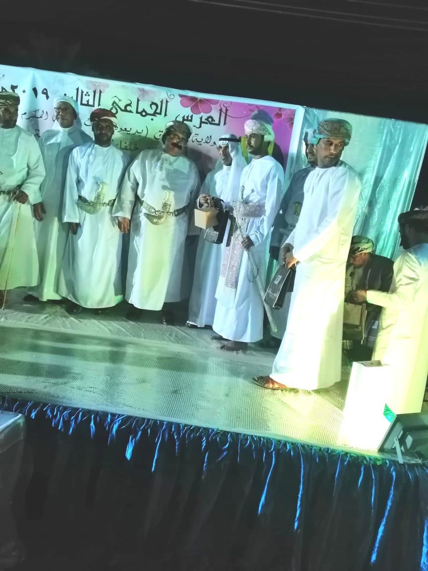 وفي ختام الحفل قام راعي المناسبة الشيخ /أحمد بن خلفان الغفيلي وبمعية رشيد البلدة بتوزيع الهدايا للمعاريس متمنين لهم زواج الدهر والحياة السعيدة