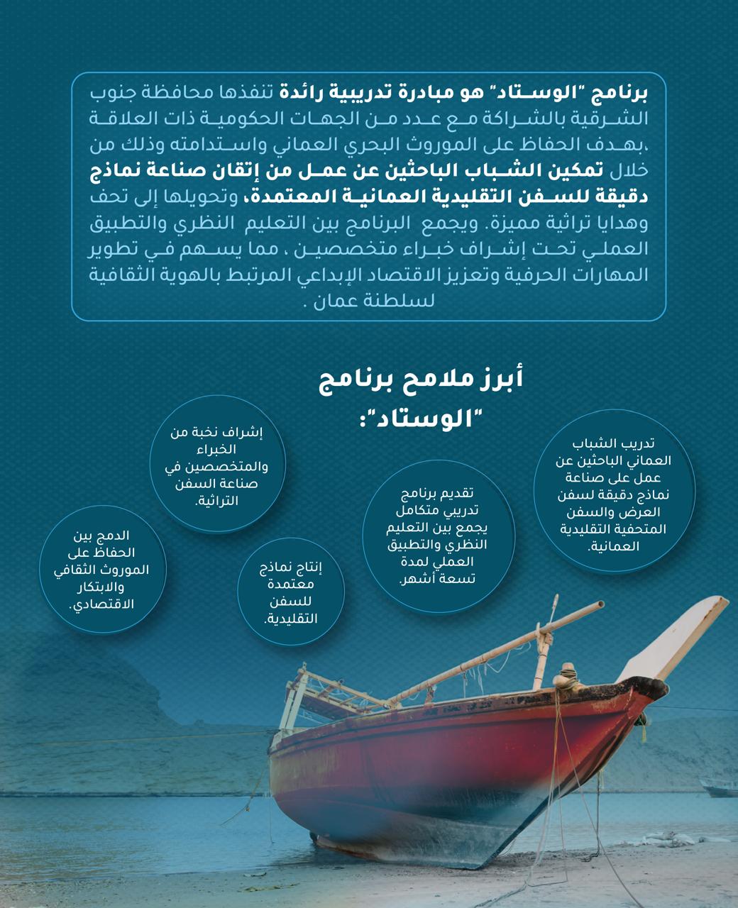 أعلنت محافظة جنوب الشرقية عن تنفيذ مبادرة تدريبية بعنوان (الوستاد) وذلك بالشراكة مع عدد من الجهات الحكومية ذات العلاقة، والتي تُعنى بصناعة نماذج السفن التقليدية العمانية.
