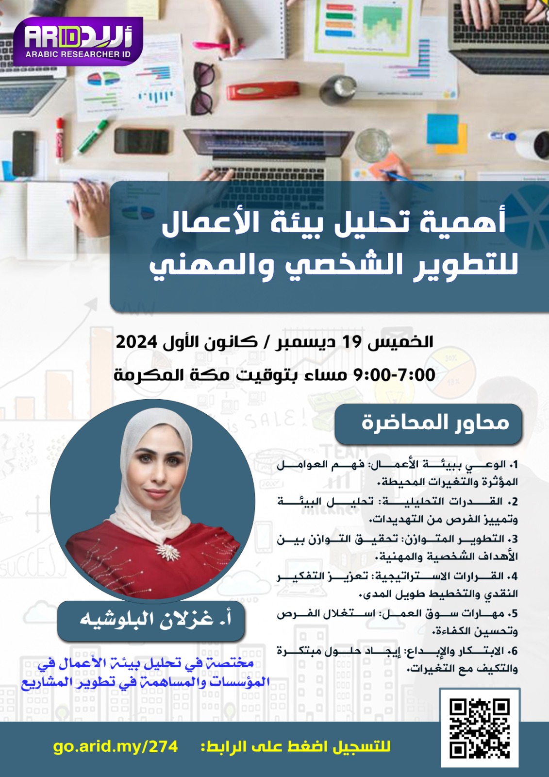 نظمت منصة (أريد) للناطقين باللغة العربية ورشة عمل بعنوان (أهمية تحليل بيئة الأعمال للتطوير الشخصي والمهني)، قدمتها الأستاذة غزلان البلوشية، المتخصصة في تحليل بيئة الأعمال وتطوير المشاريع. انعقدت الورشة يوم الخميس 19 ديسمبر 2024، من الساعة 7:00 إلى 9:00 مساءً بتوقيت مكة المكرمة، بمشاركة واسعة من مختلف أنحاء الوطن العربي والإسلامي، بالإضافة إلى حضور أكاديميين بارزين من الجامعات العربية.