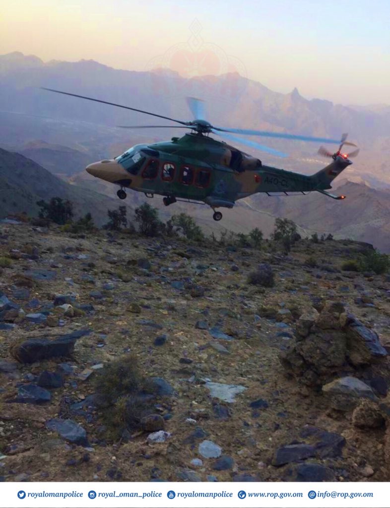 ذكر حساب شرطة عمان السلطانية على توتير بإن إدارة طيران الشرطة نفذت عملية إنقاذ لامرأة بعد سقوطها من على جبل في أحدى المناطق الجبلية الوعرة بوادي السحتن بولاية الرستاق.