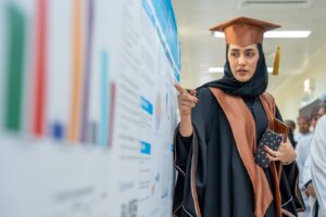 وفي ختام البرنامج وزعت سعادة الدكتورة راعية الحفل شهادات التخرج على الخريجين . وتجولت سعادتها في المعرض المصاحب الذي تضمن ملصقات لأبحاث التخرج للخريجين، حيث استمعت والحضور منهم إلى شرح واف عنها.