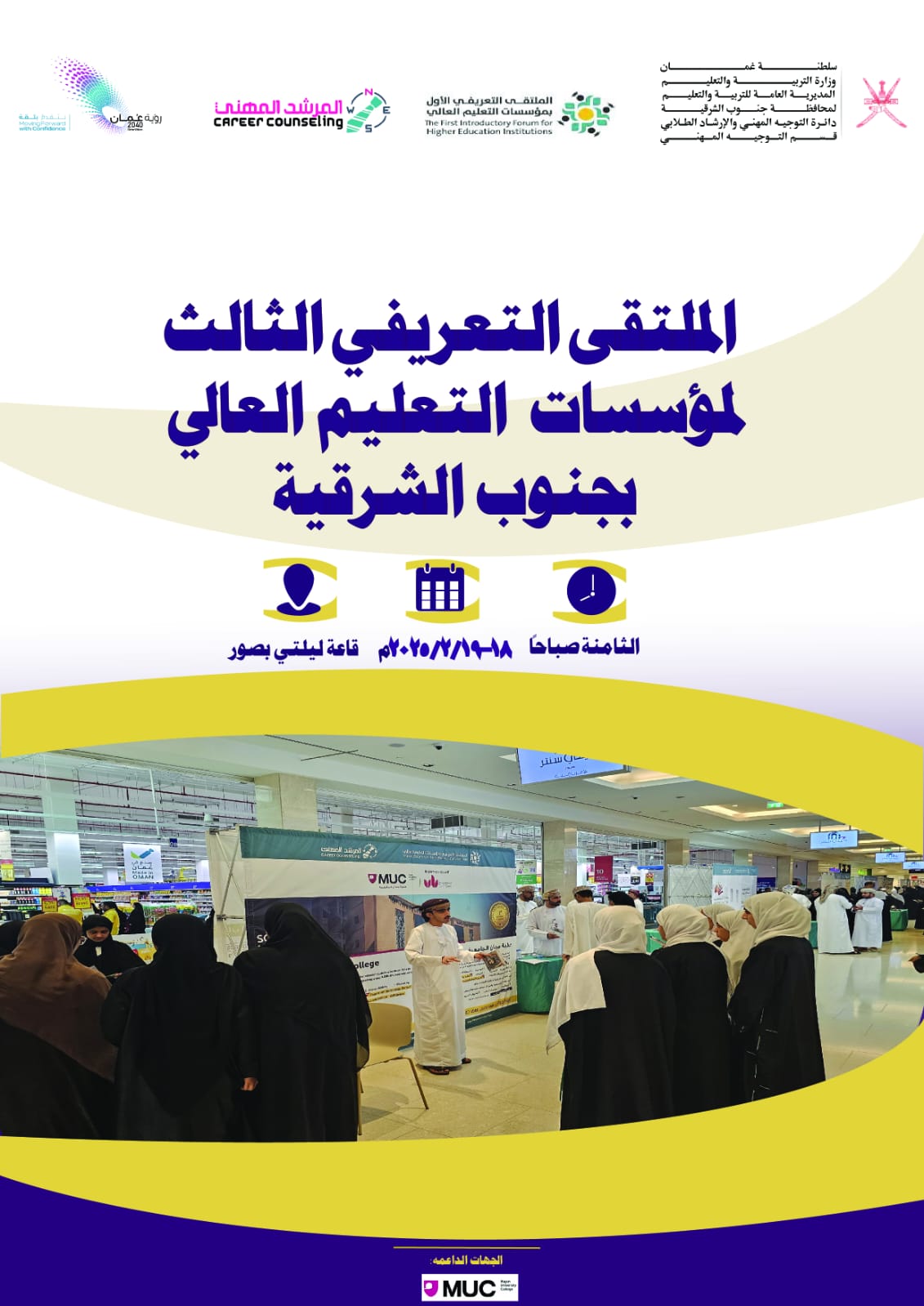 ويأتي تنظيم الملتقى الثالث في إطار جهود المديرية العامة للتربية والتعليم لمحافظة جنوب الشرقية لتوجيه الطلبة ومساعدتهم في اختيار مسارهم الدراسي والمهني المناسب كما يساهم الملتقى في تعزيز التواصل بين أخصائيً وأخصائيات التوجيه المهني والطلبة وأولياء الأمور، وتوفير المعلومات اللازمة لهم لاتخاذ قرارات مستنيرة بشأن مستقبل أبنائهم، ويشكّل الملتقى التعريفي بمؤسسات التعليم العالي الحكومية والخاصة فرصةً مثمرة للطلبة وأولياء الأمور، للتعرف على مختلف الخيارات المتاحة لهم في مجال التعليم العالي، واتخاذ خطواتٍ واثقةٍ نحو مستقبلٍ واعدٍ.