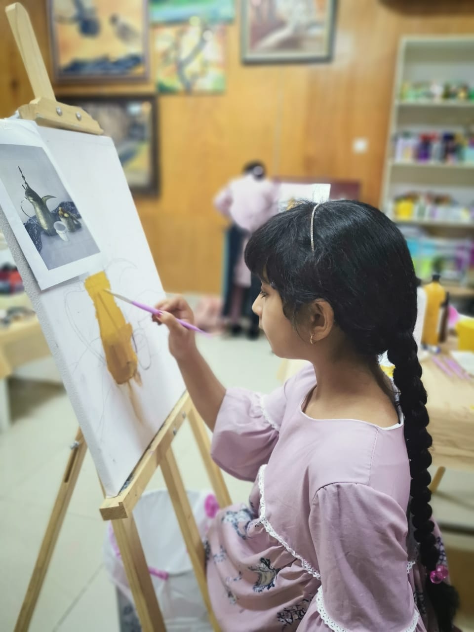وتحدثت الفنانة التشكيلية سامية الغريبية قائلة: تأتي هذه الدورة ضمن برامج وفعاليات المرسم الحر بجمعية المرأة العمانية بالبريمي في تقديم دورات تدريبية منوعة في مجالات الفن التشكيلي حيث تم التركيز في هذه الدورة على رسم الدلة العربية بألوان الأكريليك مع التركيز ع كيفية استخدام الألوان ودمجها ورسم التكوين والظل والنور وإخراج عمل فني متكامل، وقد وجدنا تجاوب جميل من المشاركات وكان اداؤهن رائع بالنسبه لمراحلهن العمريه تنم عن الإبداع الكامن الذي تتحلى فيه كل واحده فيهم.