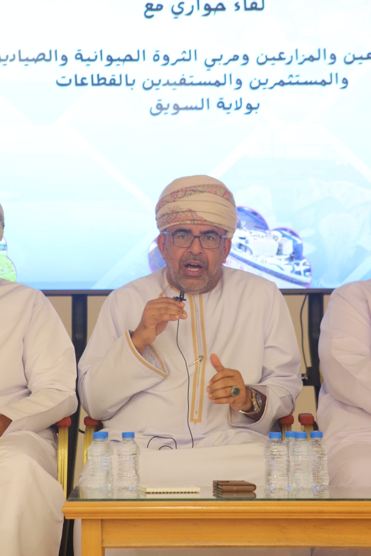 حيث التقى سعادة الشيخ عيسى بن احمد المعشني والي السويق بحضور المهندس عبدالله بن محمد الهدابي مدير عام المديرية العامة للثروة الزراعية والسمكية وموارد المياه بشمال الباطنة بعدد من المواطنين والمنتفعين من مزارعين، ومربي الثروة الحيوانية، والصيادين والمختصين في قطاعي الزراعة والثروة السمكية