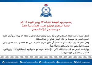 بمناسبة يوم النهضة المباركة 23 يوليو المجيد 2019م… جلالة السلطان المعظم يصدر عفواً سامياً خاصاً عن عدد من نزلاء السجن