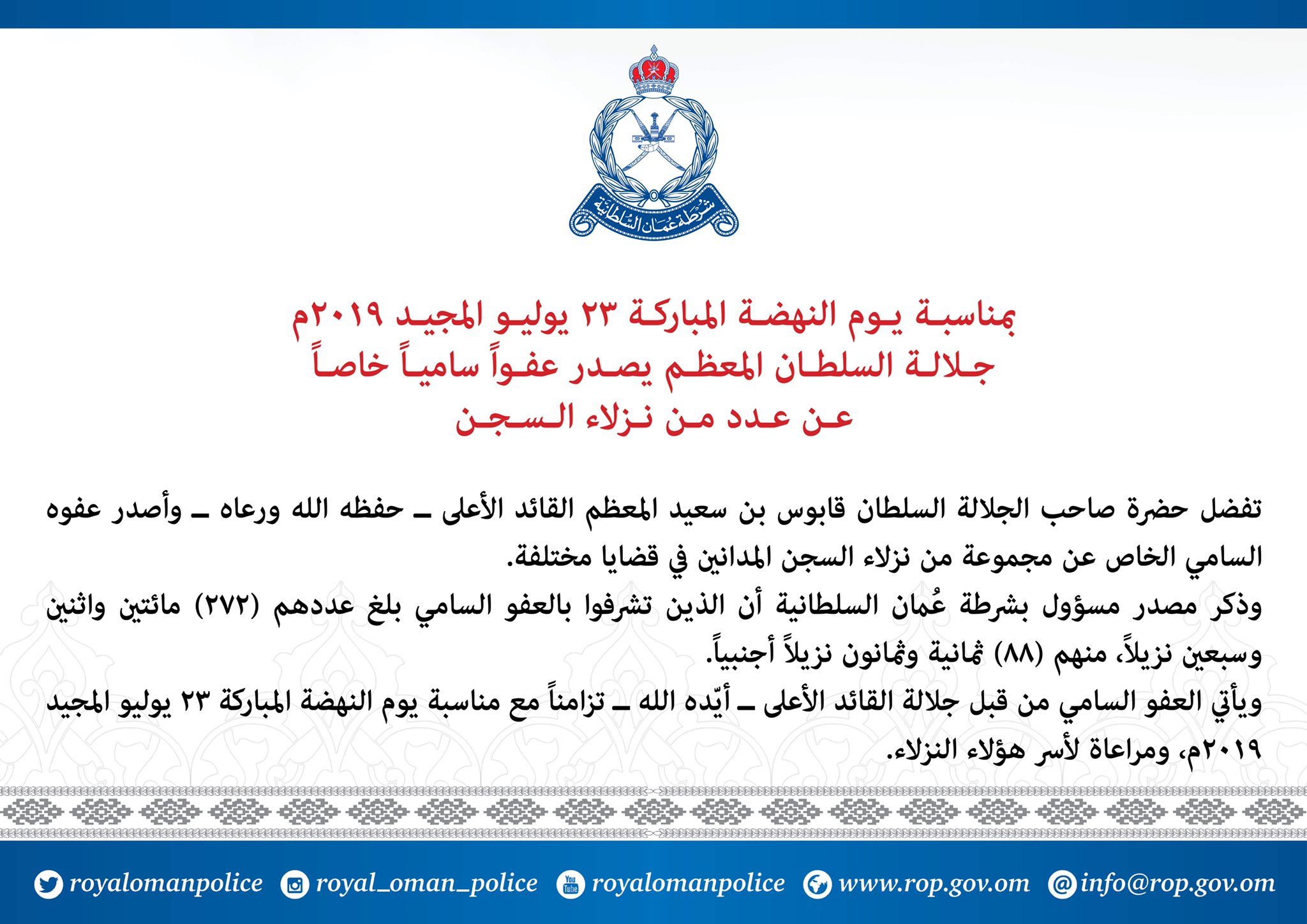 ذكرت الشرطة أنه وبمناسبة يوم النهضة المباركة 23 يوليو المجيد 2019م، جلالة السلطان المعظم يصدر عفواً سامياً خاصاً عن عدد من نزلاء السجن…