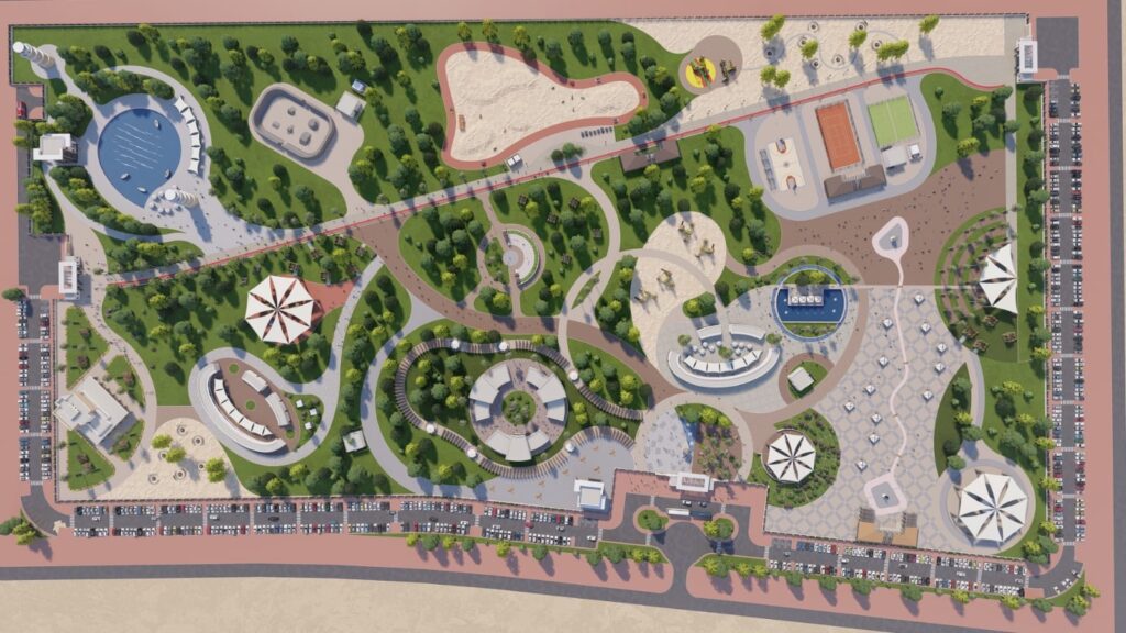 وقد روعي في تصميم الحديقة تحقيق أعلى معايير الجودة والاستدامة، حيث ستحوي الحديقة على مسارات صحية ومسطحات خضراء وبحيرة مائية ونوافير ومناطق ألعاب للأطفال ومظلات وأماكن جلوس. كما سيشتمل المشروع على ساحة متعددة الاستخدامات للفعاليات الموسمية، ومسرحًا مفتوحًا للفعاليات يتسع لـ 600 زائر، ومناطق للأنشطة المتنوعة (رياضة الفروسية – رياضة دراجات الدفع الرباعي – رياضات التزلج – رياضة جدار التسلق – رياضة السلك الانزلاقي) ومنطقة ملاعب مخصصة لكرة القدم والتنس والمضرب ومنطقة تجارية، ومجسمات جمالية تعكس الطابع الهندسي العماني. إضافة الى منطقة مطاعم ومقاه وعدد أكثر من (700) موقف، وكافة المرافق الخدمية لتلبي احتياجات الزوار.