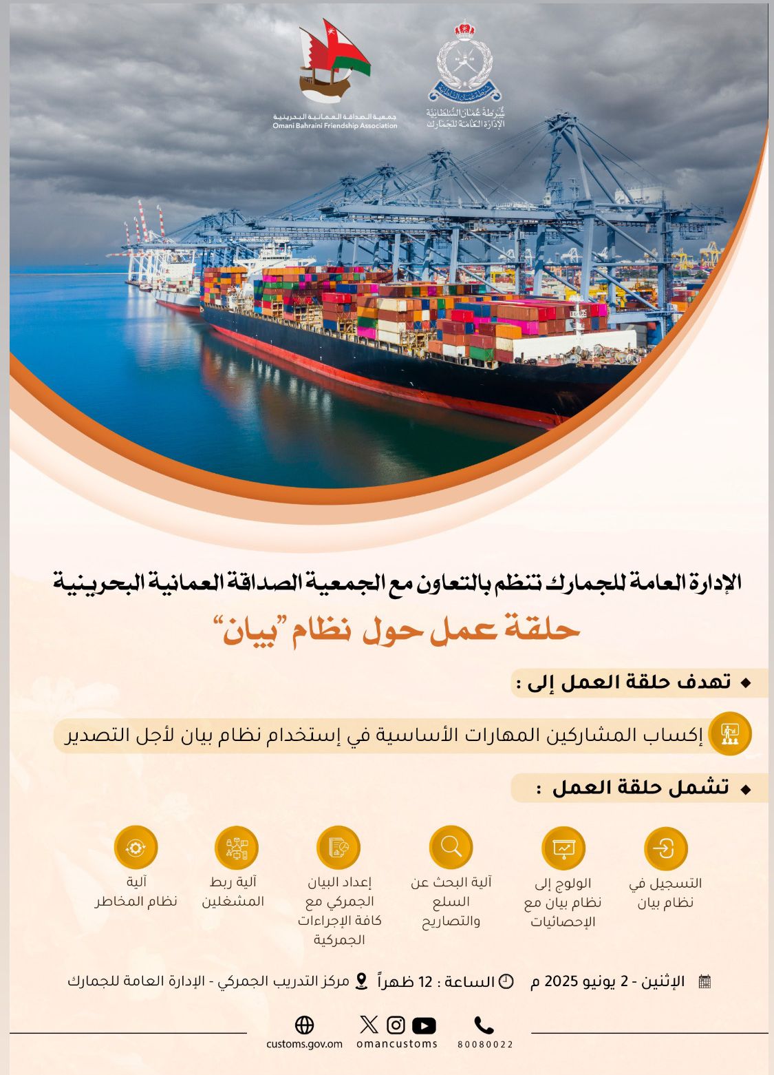 تنظّم الإدارة العامة للجمارك، بالتعاون مع جمعية الصداقة العمانية البحرينية، حلقة عمل تدريبية متخصصة حول نظام “بيان”، وذلك في إطار الجهود المستمرة لتعزيز كفاءة العاملين في مجال التخليص الجمركي وتيسير إجراءات التصدير.